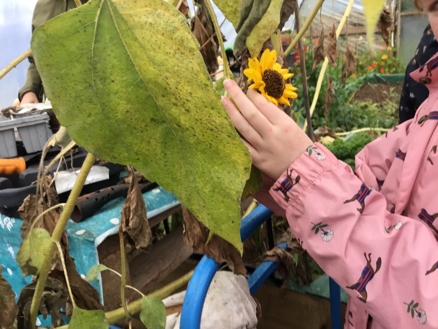 The P4 class has  been working hard in the polytunnel this term. This week we cut the heads off the sunflowers. We are hoping to get some seeds for next year out of the dead heads we have cut off.